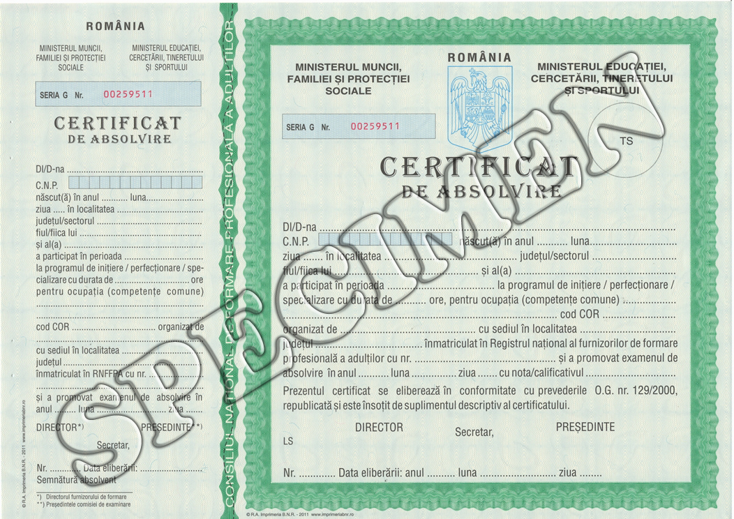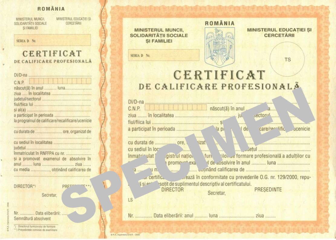 Firmă de formare profesională vă pune la dispoziţie o gamă variată de cursuri de calificare în diferite domenii de activitate pentru persoanele care doresc să înveţe o meserie , dar şi pentru cei care lucrează şi nu deţin un certificat de calificare. Cursurile sunt organizate la un nivel de pregătire teoretică şi practică pentru cursanţi, cât mai ridicat astfel încât absolvirea cursurilor să reprezinte o garanţie şi pentru angajator. Toate certificatele sunt eliberate de Ministerul Muncii , Familiei şi Egalităţii de Şanse şi Ministerul Educaţiei , Cercetării şi Tineretului recunoscute la nivel european.